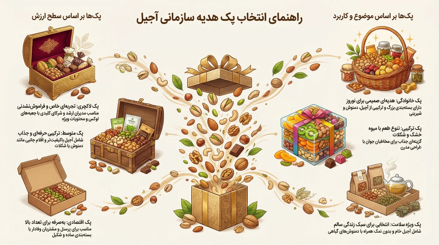پکهای هدیه سازمانی آجیل با توجه به بودجه، جایگاه مخاطب و هدف برند، در مدلهای متنوعی طراحی میشوند. انتخاب پک مناسب میتواند حس قدردانی، توجه و حرفهای بودن سازمان را منتقل کند و تأثیر مثبتی بر روابط کاری و تصویر برند در ذهن دریافتکننده ایجاد نماید.