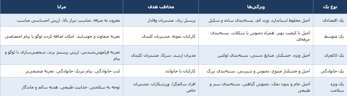 تنوع و انعطافپذیری: پکها میتوانند از آجیل اقتصادی تا لاکچری با اقلام جانبی متنوع انتخاب شوند و برای گروههای مختلف، گزینه مناسب پیدا شود.
