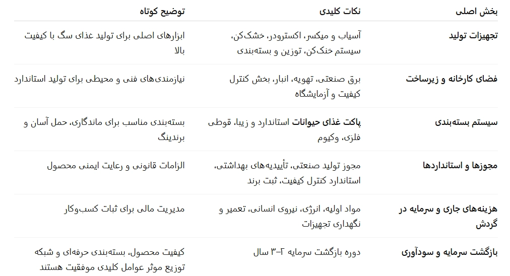 راهاندازی یک واحد تولید غذای سگ نیازمند فضای صنعتی استاندارد است. مهمترین الزامات زیرساختی شامل موارد زیر میشود: