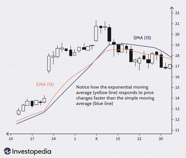 میانگین متحرک نمایی وزن بیشتری به قیمتهای اخیر میدهد تا به این ترتیب واکنشپذیری بیشتری نسبت به اطلاعات جدید داشته باشد. برای محاسبه یک EMA، ابتدا میانگین متحرک ساده (SMA) در یک دوره خاص محاسبه میشود.