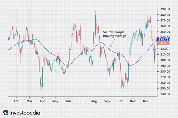 میانگین متحرک ساده (SMA) با محاسبه میانگین حسابی یک مجموعه مشخص از مقادیر در یک بازه زمانی مشخص محاسبه میشود. مجموعهای از اعداد یا قیمتهای سهام با هم جمع میشوند و سپس بر تعداد قیمتهای موجود در مجموعه تقسیم میشوند.