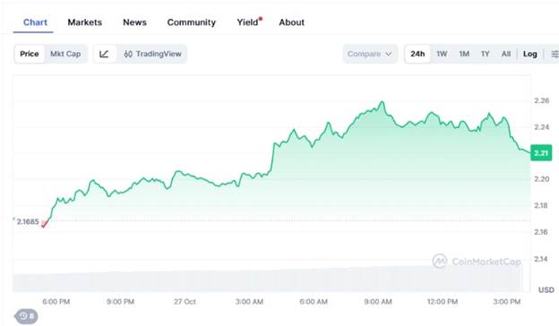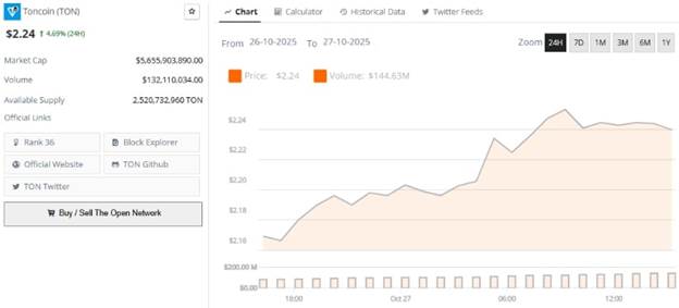 تون کوین (TON) در حال حاضر با قیمت ۲٫۲۱ دلار معامله میشود و دارای ارزش بازار ۵٫۵۹ میلیارد دلار و حجم معاملات ۲۴ ساعته ۱۴۶٫۶ میلیون دلار است، که نشان دهندهی نقدینگی بالا و رشد پایدار بازار آن است.(منبع CoinMarketCap )