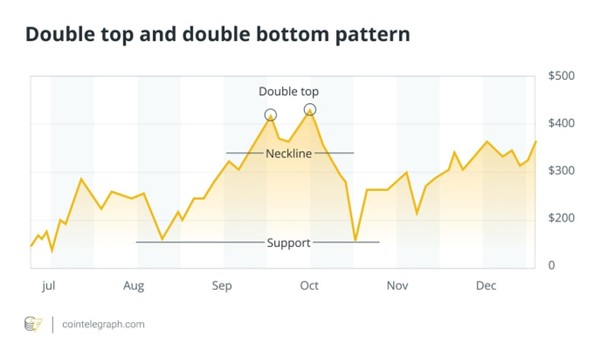 چگونه بخوانیم: این الگوها نشاندهنده دو تلاش ناموفق برای شکست مقاومت (قله) یا حمایت (دره) هستند. تأیید زمانی رخ میدهد که قیمت خط گردن را قطع کند: نزولی برای قلههای دوگانه و صعودی برای درههای دوگانه. ارتفاع بین خط گردن و قلهها یا درهها را اندازهگیری کنید و سپس آن را از نقطه شکست برای برآورد حرکت پیشبینی کنید.