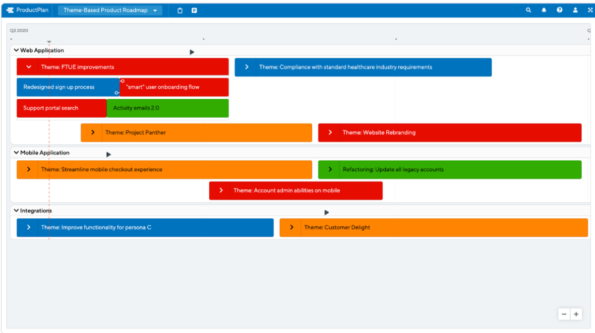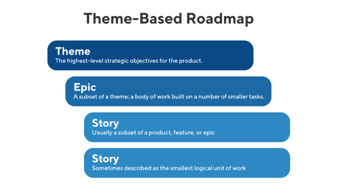 به جای سازماندهی نقشه راه خود بر اساس ویژگی ها، سعی کنید نقشه راه خود را بر اساس تم ها یا نتایج حاصل شده از چندین قابلیت در کنار هم گروه بندی کنید. تم چند لایه بالاتر از استوری قرار می گیرد و معمولا نتایجی که از یک مجموعه اپیک و استوری مرتبط با یک موضوع خاص به دست می آید اشاره دارد. به عنوان مثال یکی از تم هایی که در یک اپلیکیشن مالی می توانید داشته باشید تم ریتنشن یا برگشتن به اپلیکیشن و استفاده مجدد از آن می باشد. این تم شامل هر قابلیت یا دسته قابلیتی می شود که منجر به برگرداندن کاربران به اپلیکیشن شما و استفاده مجدد از ویژگی های آن می شود. تم ها اجازه می دهند تا انعطاف پذیری بیشتری در تعریف آنچه ساخته می شود بدون تعهد بیش از حد به ویژگی های خاص داشته باشید.