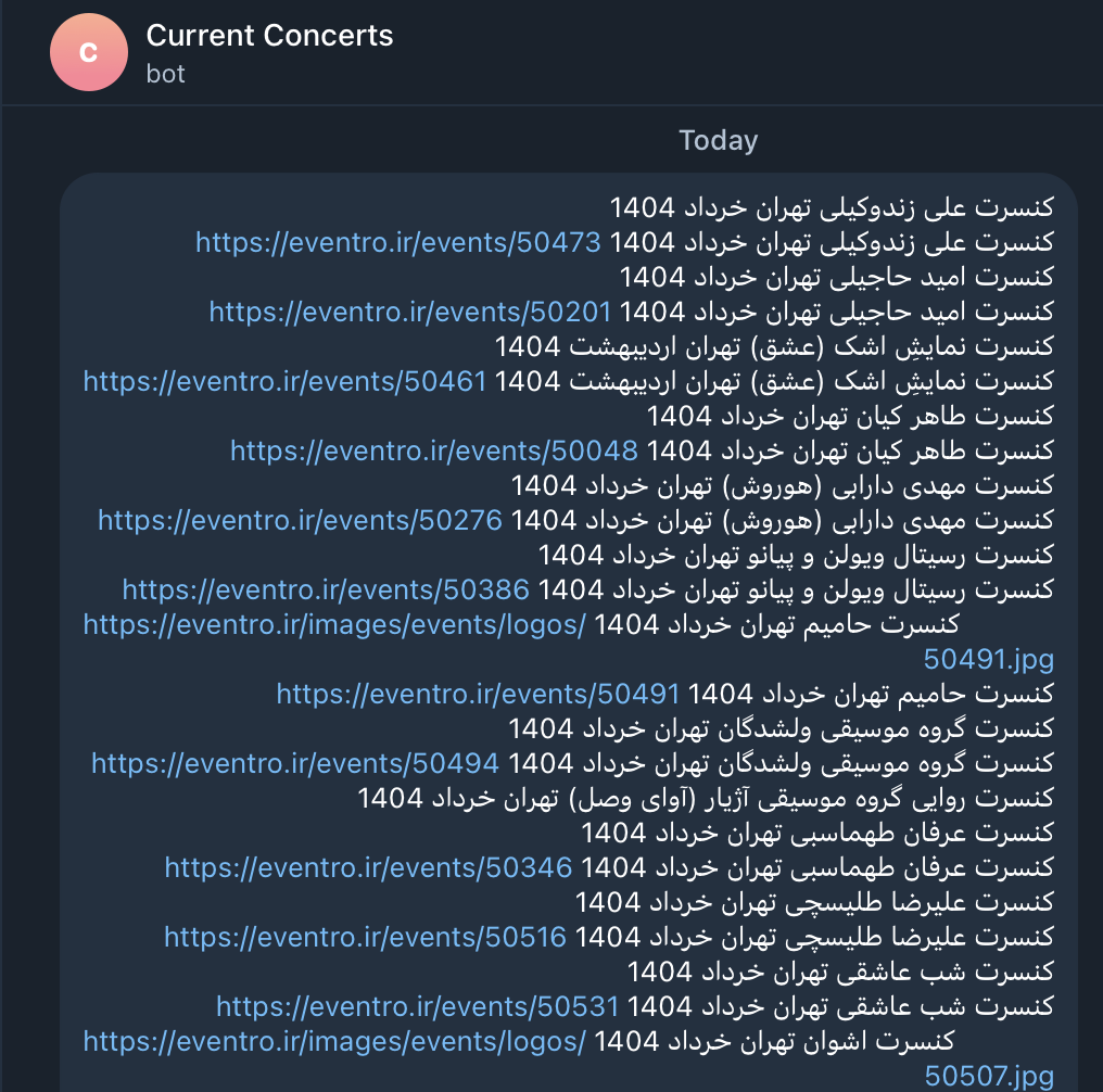 در نهایت چنین پیامی توی تلگرام ارسال میشه که خیلی محتوای بهدردنخوری هم داره و متوجه میشید چرا کنسرتهای قربانی سریع فروش میره.