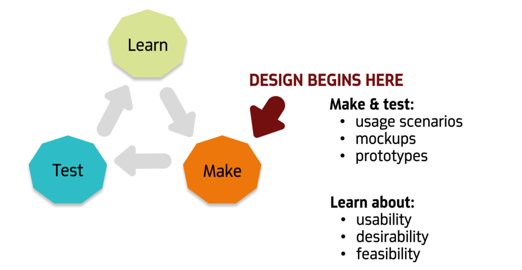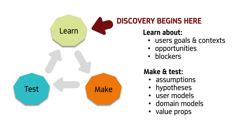 در هر مرحله، مدیران محصول میخواهند ارزشمندترین فعالیتها را انتخاب کنند که به تیم این امکان را میدهد که تا حد امکان در مورد نیازهای فعلی کاربران خود در چارچوب اهداف کسب و کار، یاد بگیرند ، سپس یک کاندید راه حل را بسازند که هدف آن رفع نیازهای کاربران است، و در نهایت راه حلهای خود را با آزمایشهایی آزمایش کنند تا مناسب بودن آنها را برای هدف تعیین شده ارزیابی کنند. از همه مهمتر، این فرآیند یادگیری ➔ ساخت ➔ آزمایش تکراری است: بارها و بارها تکرار میشود تا زمانی که نتیجه تا حد امکان برای مرحله فعلی توسعه محصول شما بهینه باشد.