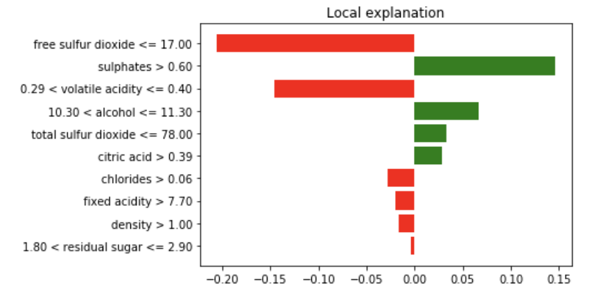 در شکل زیر میتوانیم یک تقریب محلی برای نمونه خاصی از مجموعه دادههای شناخته شده کیفیت شراب را ببینیم. مهم نیست که مدل اصلی چیست (مدل آگنوستیک)، میتوانیم یک تقریب محلی انجام دهیم تا ببینیم کدام ویژگیها و به چه میزان کمک میکنند.