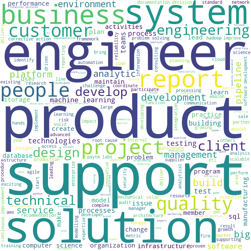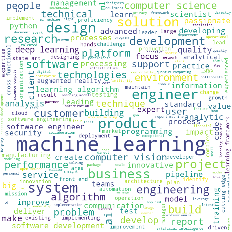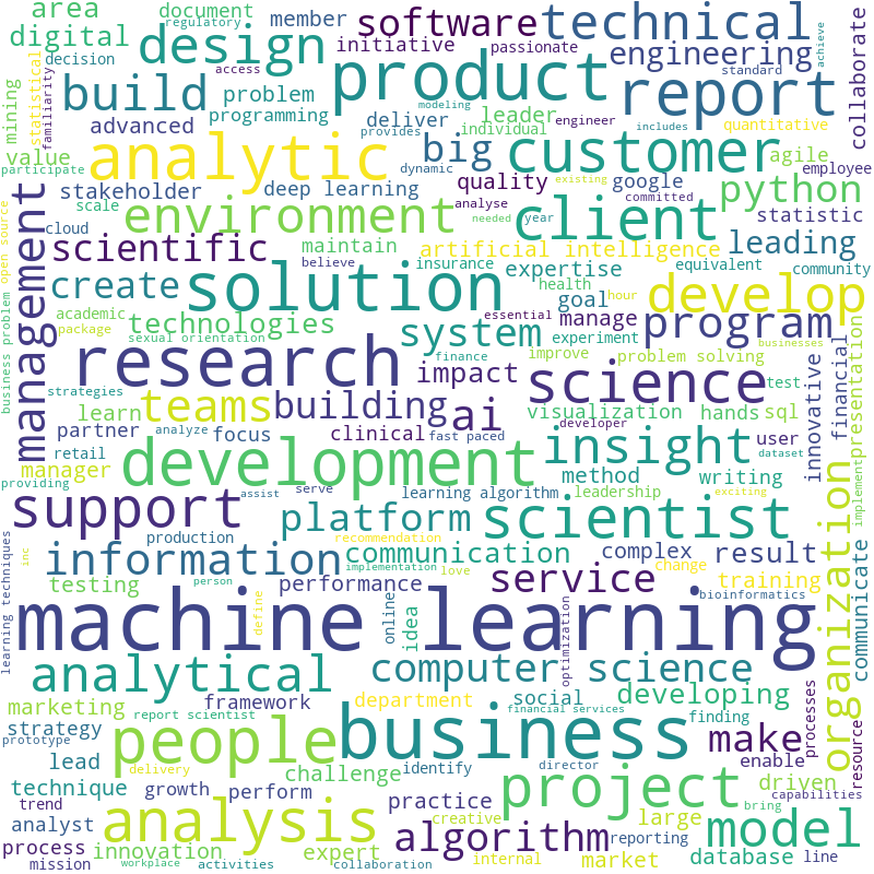 به نظر میرسد که مهندسان یادگیری ماشینی در مقایسه با دانشمندان عمومی داده قطعا دارای یک پورتفولیوی متمرکزتر هستند که شامل تحقیقات، طراحی و مهندسی است. واضح است که راهحل، محصول، نرمافزار و سیستم موضوعات غالب هستند. به همراه آنها، تحقیقات، الگوریتم، هوش مصنوعی، یادگیری عمیق و بینایی کامپیوتر نیز وجود دارد. جالب توجه است که به نظر میرسد عواملی مانند تجارت، مدیریت، مشتری و ارتباطات نیز مهم هستند. این مساله را می توان در تکرار بعدی این پروژه بیشتر بررسی کرد. از سوی دیگر، پایپلاین و پلتفرم نیز برجسته هستند، و درک مشترک از مسئولیت مهندس یادگیری ماشین در ساخت پایپلاین داده برای استقرار سیستمهای ML را تایید میکنند.