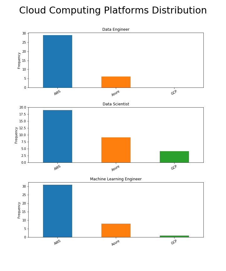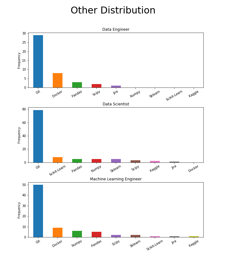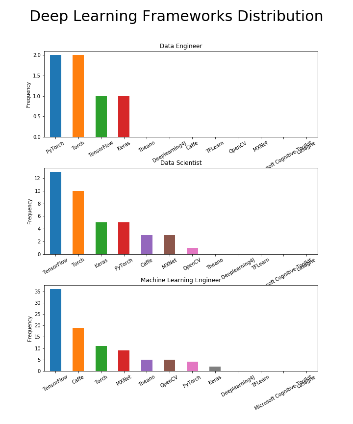 چارچوبهای یادگیری عمیق (DL) به ندرت در شرح کار مهندس داده ذکر میشوند، بنابراین به نظر میرسد که چارچوبهای یادگیری عمیق برای این نقش لازم نیستند. بیشترین اشاره به چارچوبهای DL در نقشهای مهندس یادگیری ماشین است، که نشان میدهد مهندسان ML خیلی با مدلسازی یادگیری ماشین سروکار دارند، نه فقط بهکارگیری مدل. علاوه بر این، TensorFlow قطعا در زمینه یادگیری عمیق غالب است. اگرچه Keras به عنوان یک چارچوب یادگیری عمیق سطح بالا واقعا برای دانشمندان داده محبوب است، اما تقریبا برای نقشهای یادگیری ماشینی بیارتباط است، احتمالا نشان میدهد که فعالان ML اغلب از چارچوبهای سطح پایینتر مانند TensorFlow استفاده میکنند.