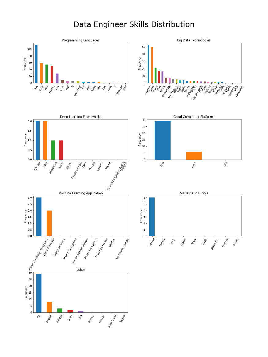 مهندسان داده دارای یک پورتفولیوی متمرکزتر نسبت به مهندسان یادگیری ماشین هستند. واضح است که تمرکز بر حمایت از محصول، سیستم و راهحل از طریق طراحی و توسعه پایپلاین است. الزامات اصلی عبارتند از مهارتهای فنی، پایگاهداده، ساختن، آزمایش، محیط و کیفیت. یادگیری ماشین نیز مهم است، احتمالا به این دلیل که پایپلاینها عمدتا برای پشتیبانی از نیازهای به کار گیری دادههای مدل ML ساخته شدهاند.