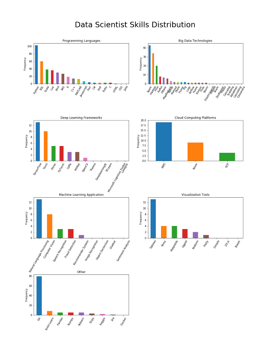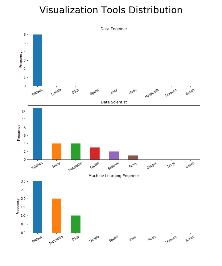 ابزارهای تجسم اغلب برای دانشمندان داده مورد نیاز هستند و هم برای مهندسان داده و هم برای مهندسان یادگیری ماشین به ندرت به آنها اشاره میشود. با این حال، تابلو (Tableau) بهترین انتخاب برای تمام نقشها است. به نظر میرسد که برای دانشمندان داده، شاینی، Matplotlib، ggplot و Seaborn به یک اندازه مهم هستند.