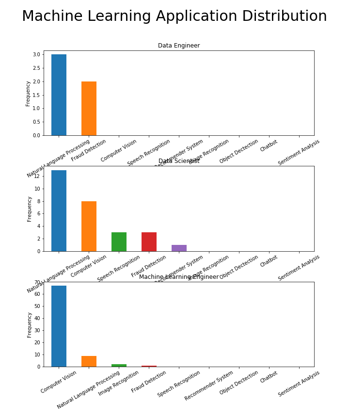 برای دانشمندان عمومی داده، پردازش زبان طبیعی بزرگترین حوزه کاربردی ML است که توسط بینایی کامپیوتر، شناخت گفتار، تشخیص تقلب و سیستمهای پیشنهاد دهنده دنبال میشود. به طور شگفتانگیز، برای مهندسان یادگیری ماشین، بزرگترین تقاضا تنها از بینایی کامپیوتر میآید و دومین تقاضا، پردازش زبان طبیعی است. از سوی دیگر، مهندسان داده متخصصان متمرکز هستند-هیچ یک از این حوزههای کاربردی ML برای آنها مناسب نیستند.