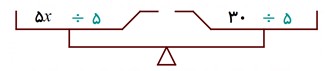 در مرحله آخر گفتم: چون به دنبال مقدار x هستیم هر دو طرف ترازو را بر 5 تقسیم می کنیم. آیا باز هم تعادل ترازو به هم می خورد؟ تقسیم به این معنی است که هر طرف را پنج قسمت مساوی می کنیم و چهار قسمت را بر می داریم و یک قسمت را می گذاریم بماند. آیا تعادل ترازو برهم می خورد؟ باز هم همه جواب دادند: خیر.
